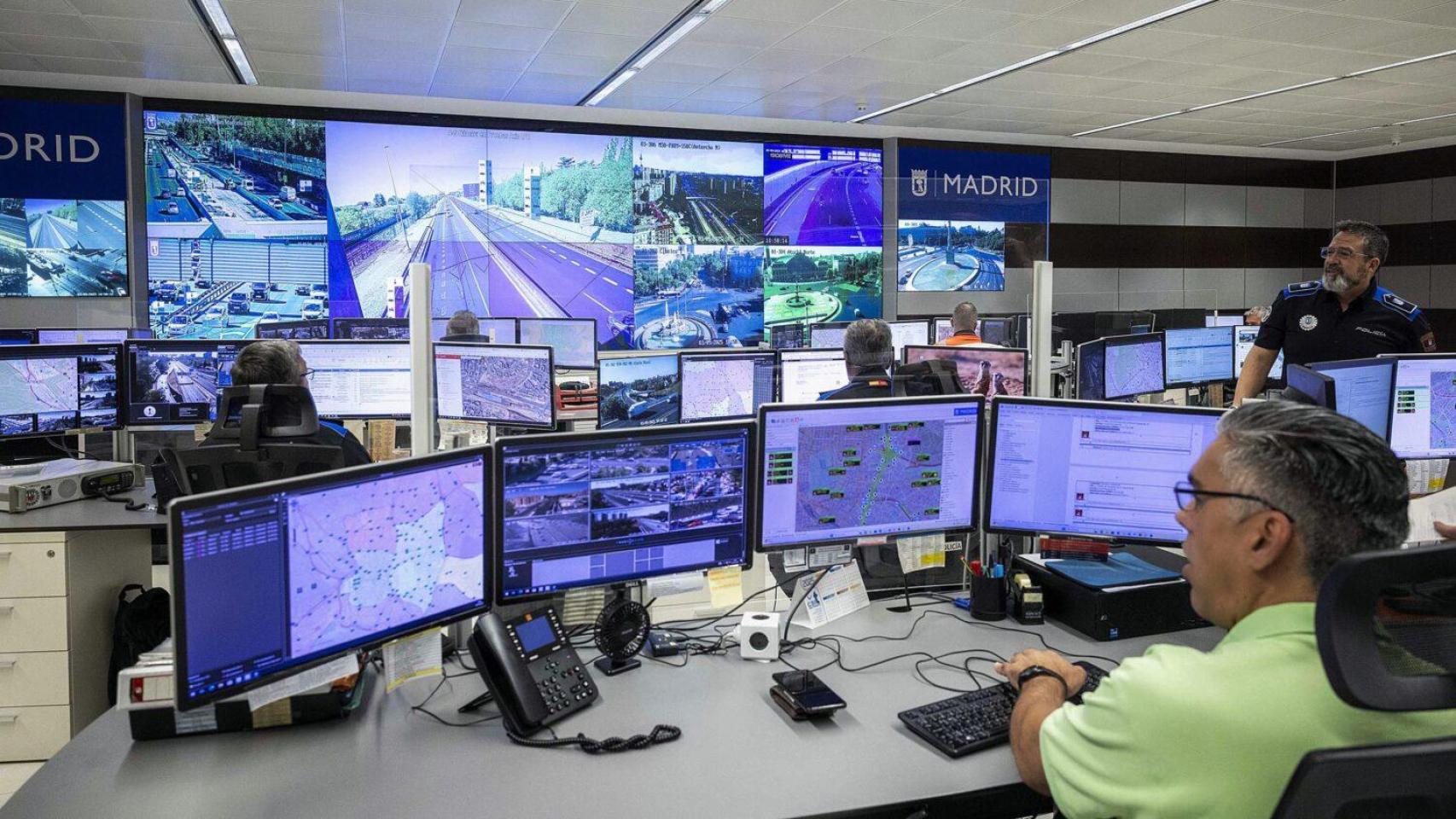Agente de movilidad comprobando el funcionamiento de las cámaras con IA en el Centro de Gestión de la Movilidad del Ayuntamiento de Madrid.