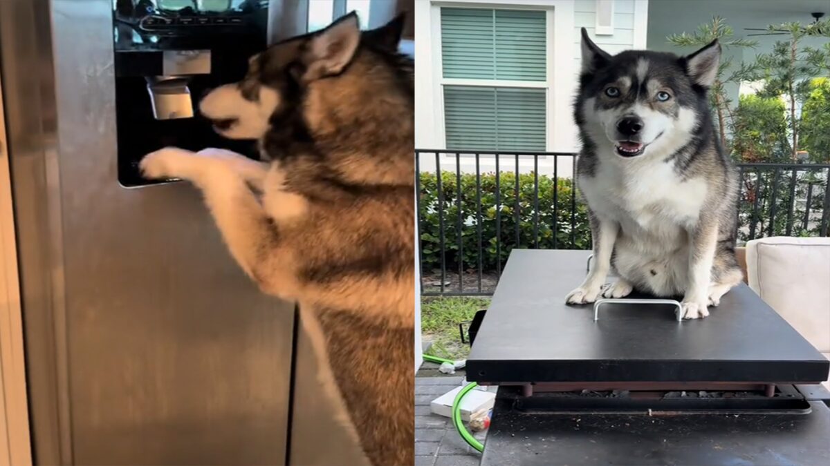 Colarse en la nevera para chupar el hielo, trepar al rascador del gato o plantarse entre dos mesas para alcanzar comida son algunas de las situaciones que más han sorprendido a la familia Moriarty con su perro husky.